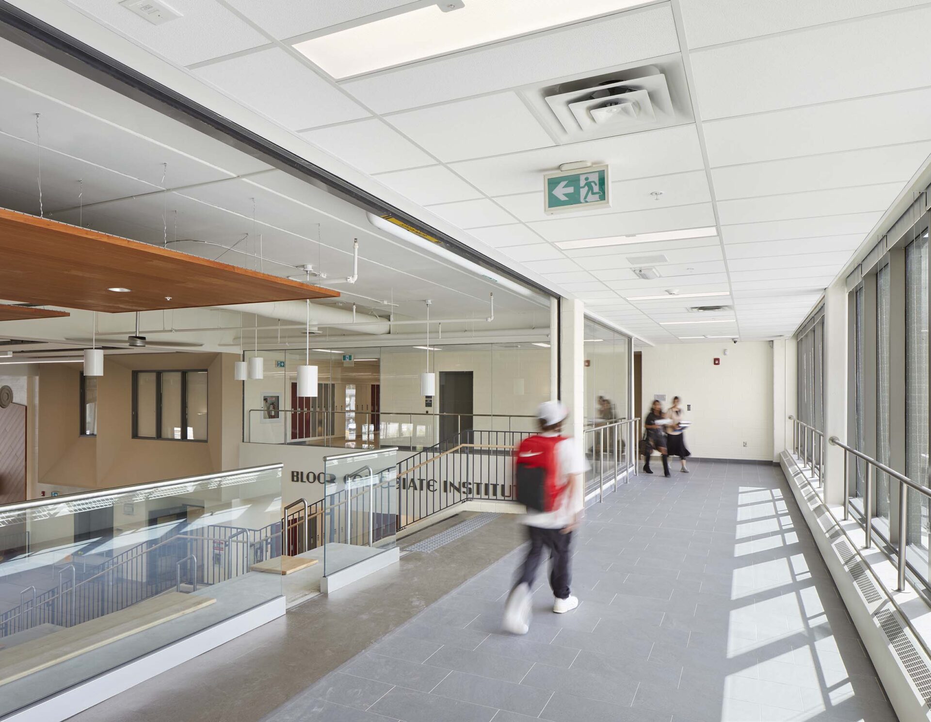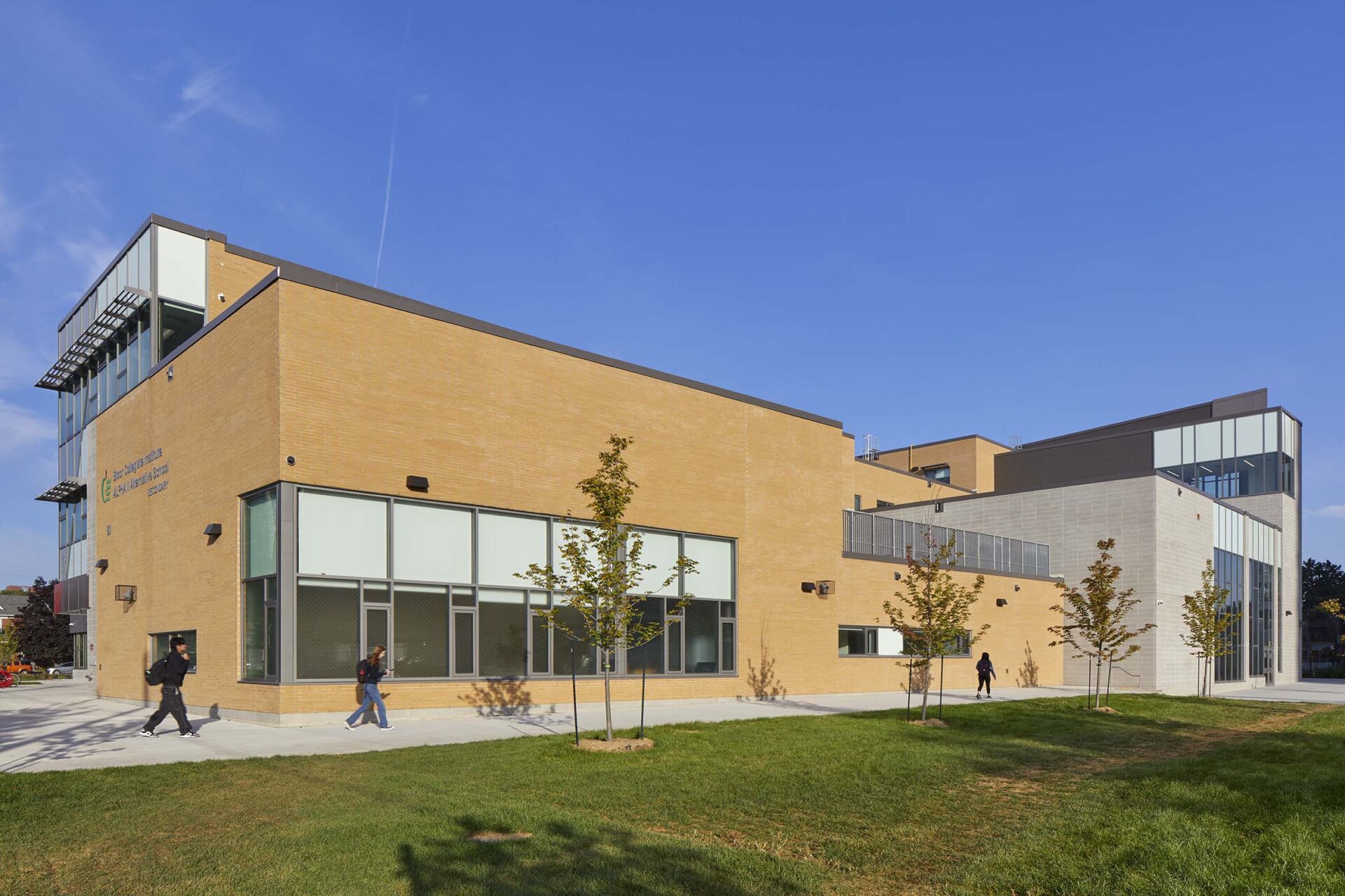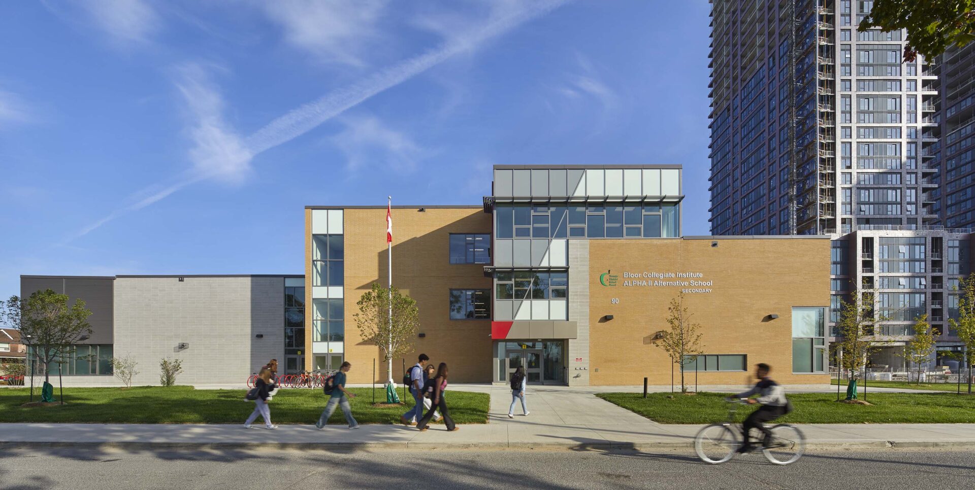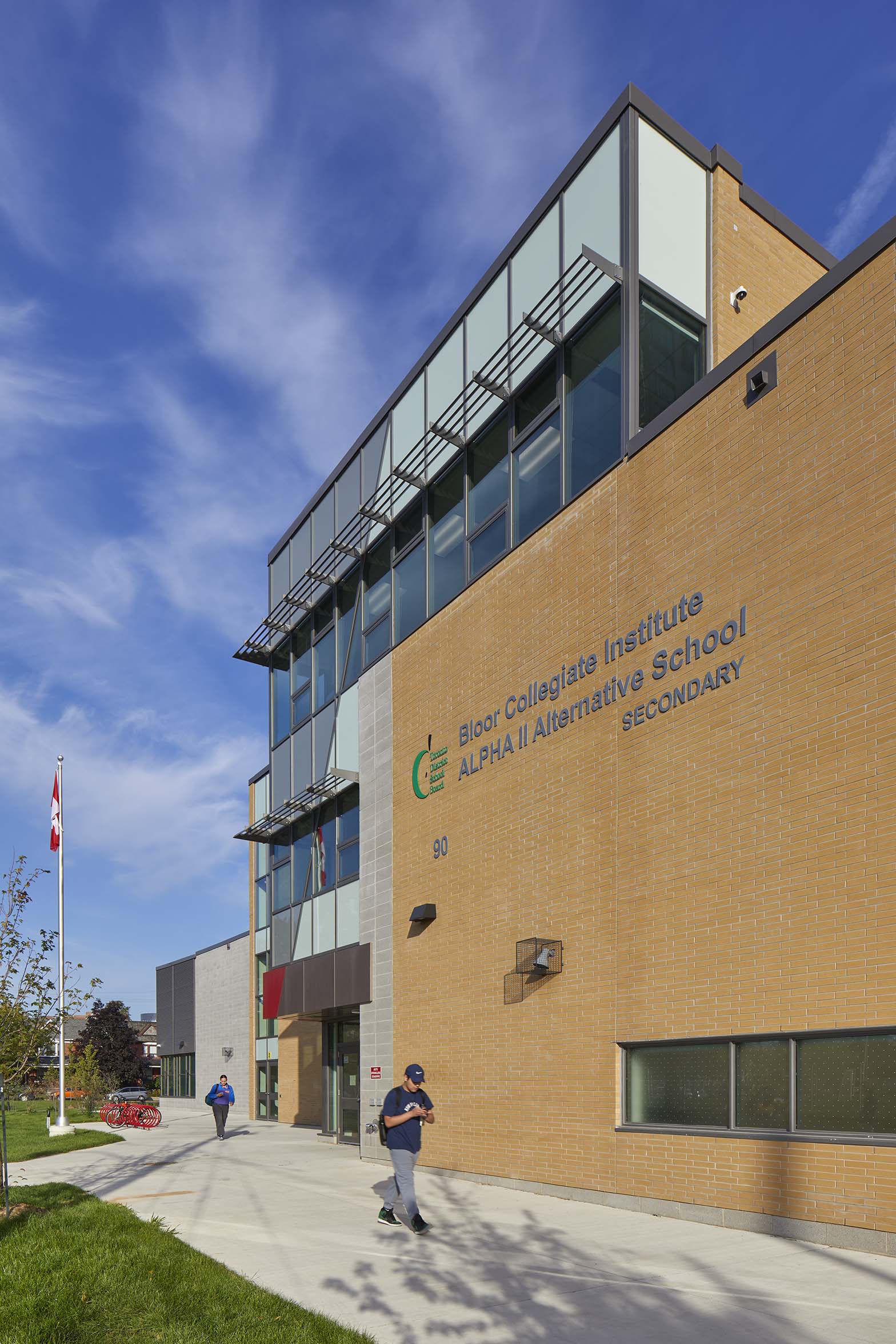 Completed in celebration of Bloor Collegiate Institute’s 100th anniversary, the new four-storey, 160,000 square foot facility with an additional level below grade marks a bold new chapter for both Bloor CI and ALPHA II Alternative School. The reimagined campus integrates a wide range of academic and creative learning spaces, including automotive and woodworking shops, specialized science and biology laboratories, a triple gymnasium, and expansive learning commons anchored by a grand atrium that encourages student interaction and collaboration. Exterior program areas include landscaped learning zones, full-size basketball courts, and extensive site works tying into adjacent municipal sidewalks and roadways. Below grade, the facility houses a 40-vehicle parking garage, a cistern holding tank, and dedicated mechanical, electrical, and storage spaces. Architecturally, the building’s warm material palette of masonry, curtain wall, and metal panels harmonizes with the surrounding urban context, while the dramatic north entrance canopy and double-height Learning Commons along Bloor Street express a strong civic identity. Inside, the student-focused design emphasizes natural light, flexibility, and community through spaces such as a multi-use cafetorium, amphitheater seating, and self-directed learning environments for ALPHA II students. Together, these elements create a vibrant, inclusive educational setting that supports both academic excellence and creative exploration.